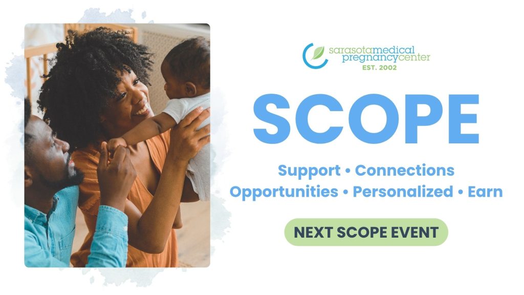 SCOPE is a monthly event for expecting moms and dads at Sarasota Medical Pregnancy Center. Participants receive guidance from medical and education staff, learn about parenting and pregnancy resources, and earn points to redeem for baby essentials. Classes cover every stage from pregnancy through the first year, helping families gain knowledge, support, and confidence.